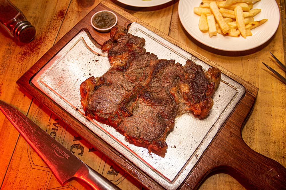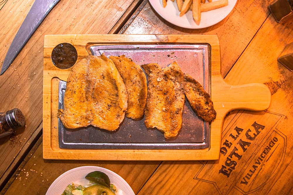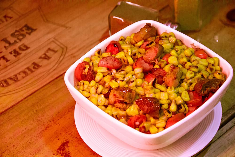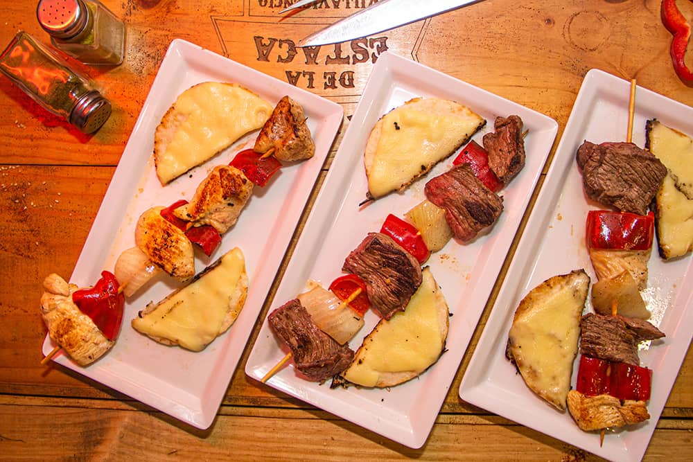 250 gr. de proteína en trozos de lomo fino de res y pollo bañados de la salsa de la casa, salchicha llanera, papa ripio, queso en trozos, mazorca salteada, salsa dulce maíz y showy.
