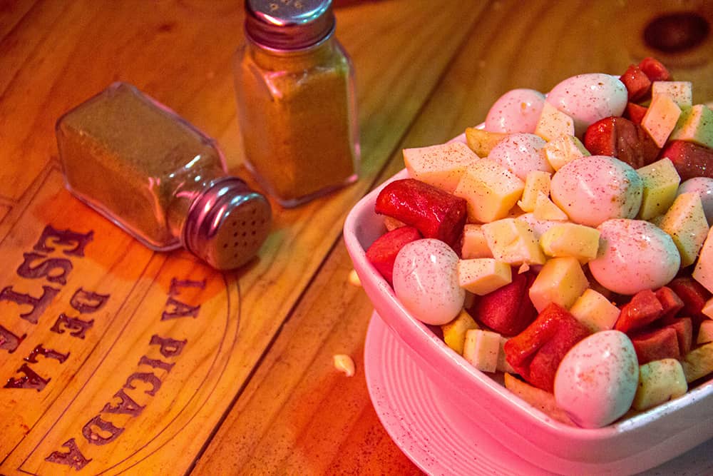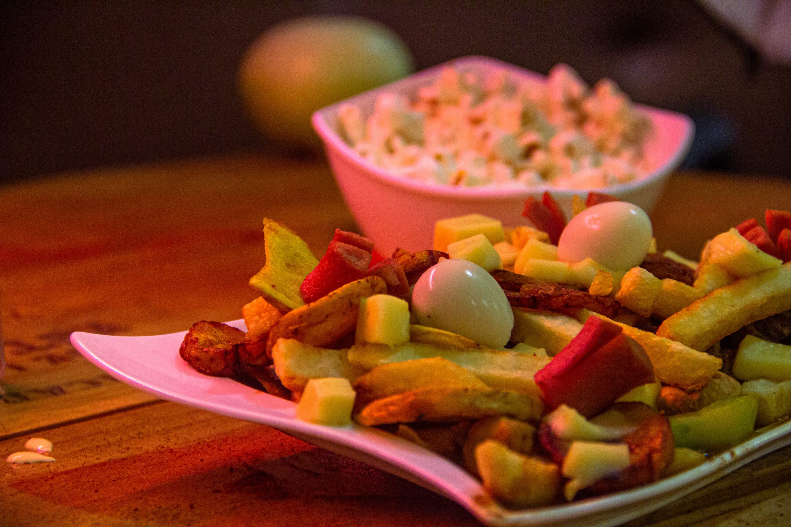 Salchicha de pollo, papa a la francesa, huevos de codorniz y trocitos de queso mozzarella.