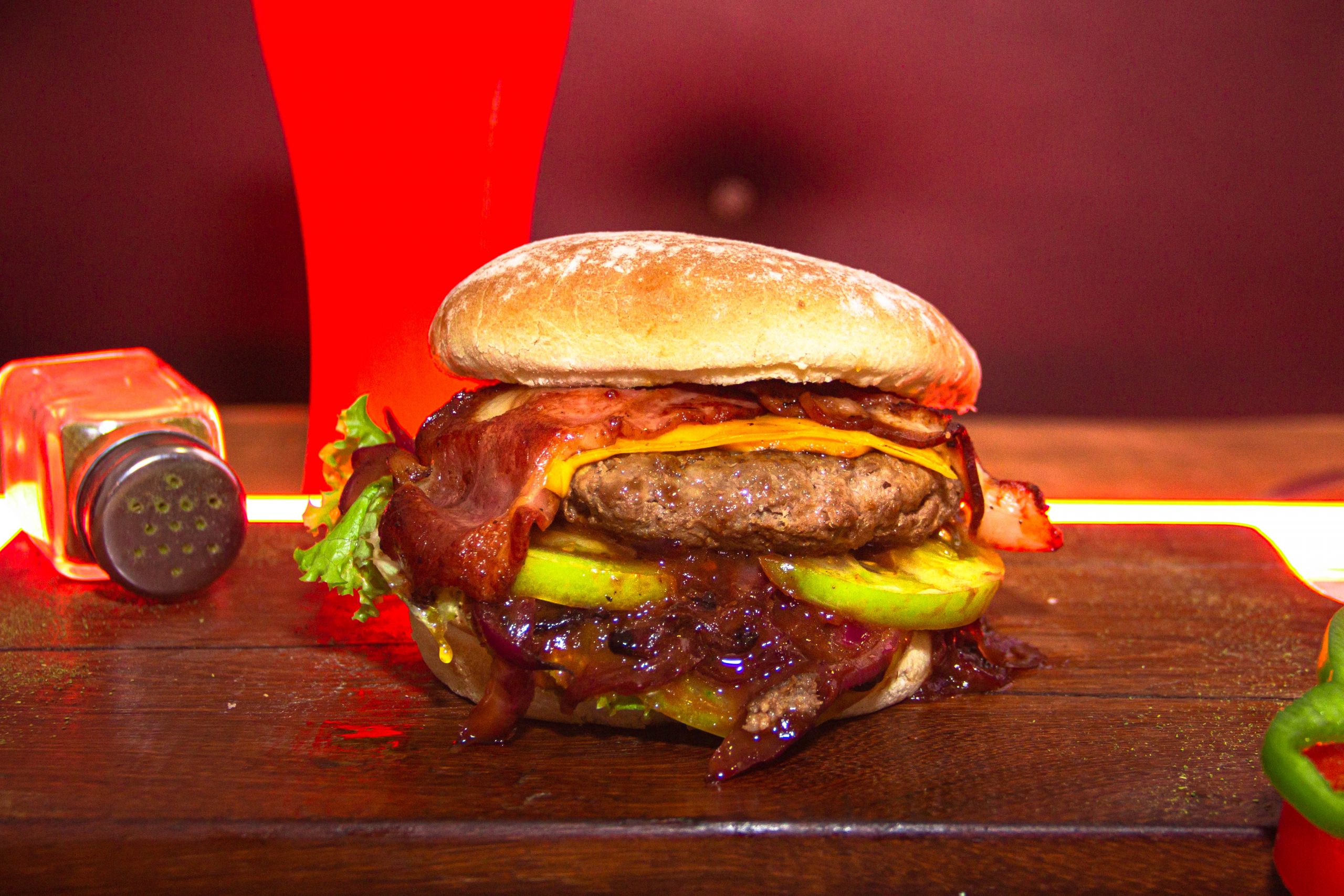 Contiene 180 gr de carne de hamburguesa artesanal, pan artesanal, queso cheddar, cebolla grille, tocineta, y vegetales (lechuga y tomate). Con porción de 150 gr de papas a la francesa.
